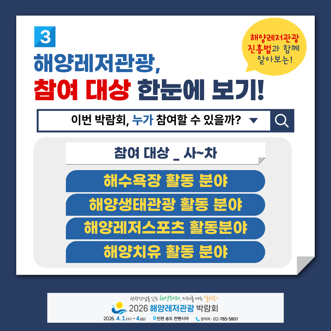 [참여 대상 3] 해양레저관광 박람회 참여 대상 한눈에 보기 ! 등록일2026.01.08 조회수12 댓글 0댓글쓰기 댓글목록 등록된 댓글이 없습니다. 이전글 [SNS 서포터즈 모집] 2026 해양레저관광 박람회 SNS 서포터즈 1기 모집 다음글 [참여 대상 2] 해양레저관광 박람회 참여 대상 한눈에 보기 ! 목록