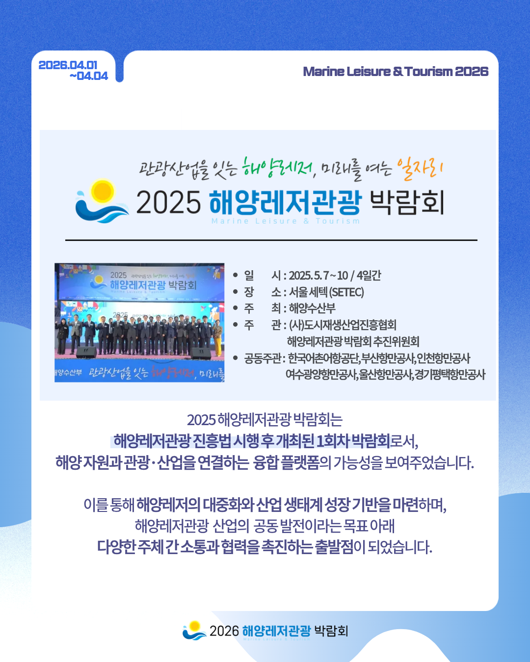2025 해양레저관광 박람회 다시 돌아보기 등록일2026.01.19 조회수22 댓글 0댓글쓰기 댓글목록 등록된 댓글이 없습니다. 이전글 독일 뒤셀도르프 보트쇼에 다녀왔어요 ! 다음글 [지자체 및 기관편] 해양레저관광박람회 참여 기대효과 ! 목록