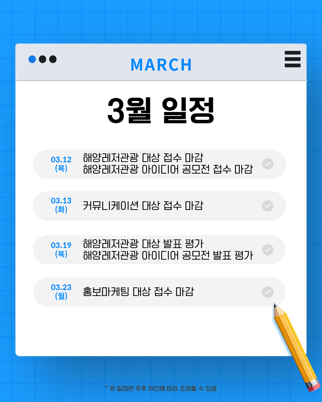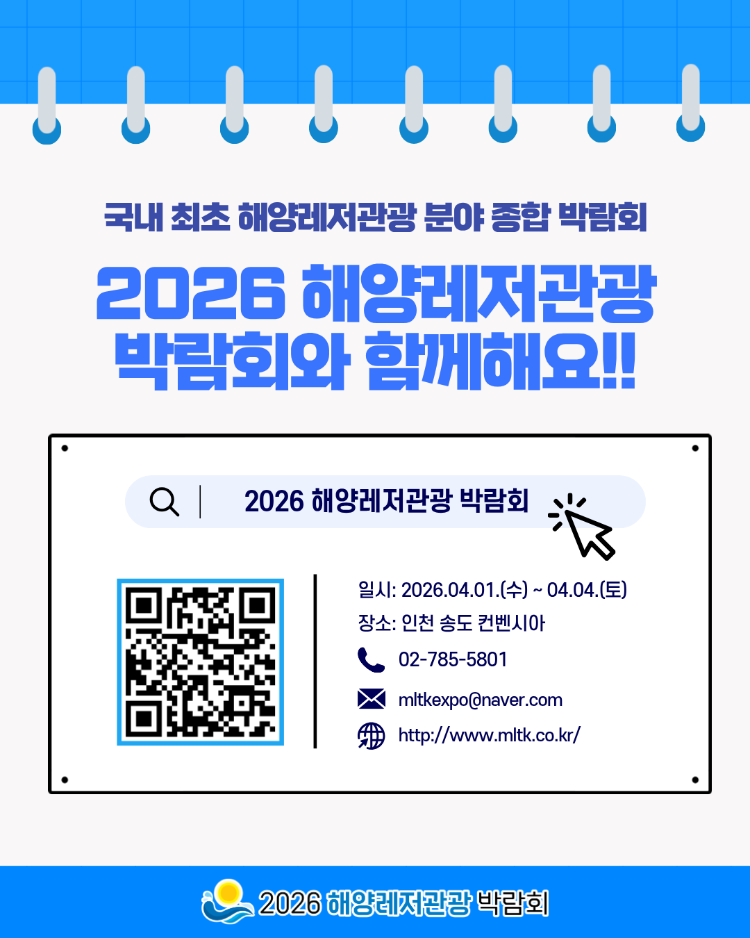 2026 해양레저관광 박람회 월별 일정 알려드려요 ! 등록일2026.02.03 조회수20 댓글 0댓글쓰기 댓글목록 등록된 댓글이 없습니다. 이전글 [산달도 어촌체험마을] 해양레저관광 우수사례 1편 다음글 독일 뒤셀도르프 보트쇼에 다녀왔어요 ! 목록