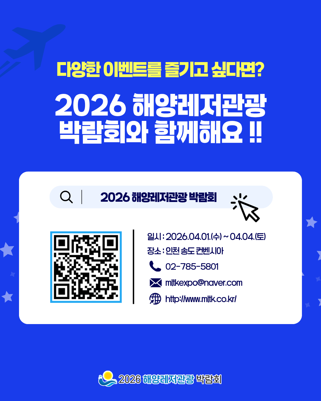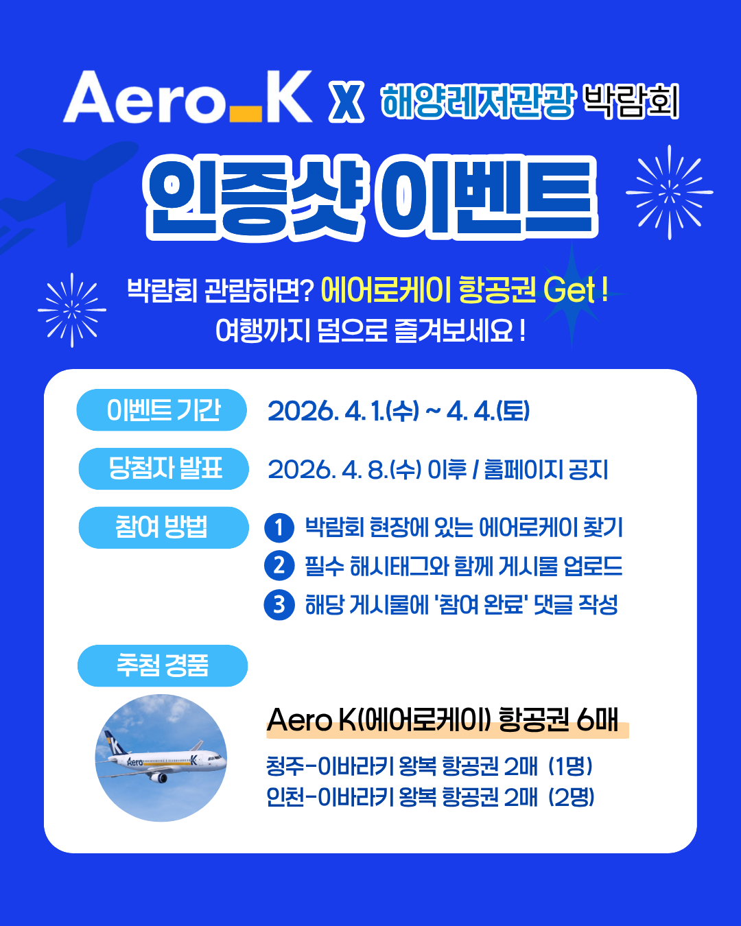 [Aero K x 해양레저관광 박람회] 항공권 EVENT 등록일2026.03.10 조회수25 댓글 0댓글쓰기 댓글목록 등록된 댓글이 없습니다. 이전글 2026 해양레저관광 박람회 가이드 1편 다음글 나에게 딱 맞는 '바다라이프'는? 목록
