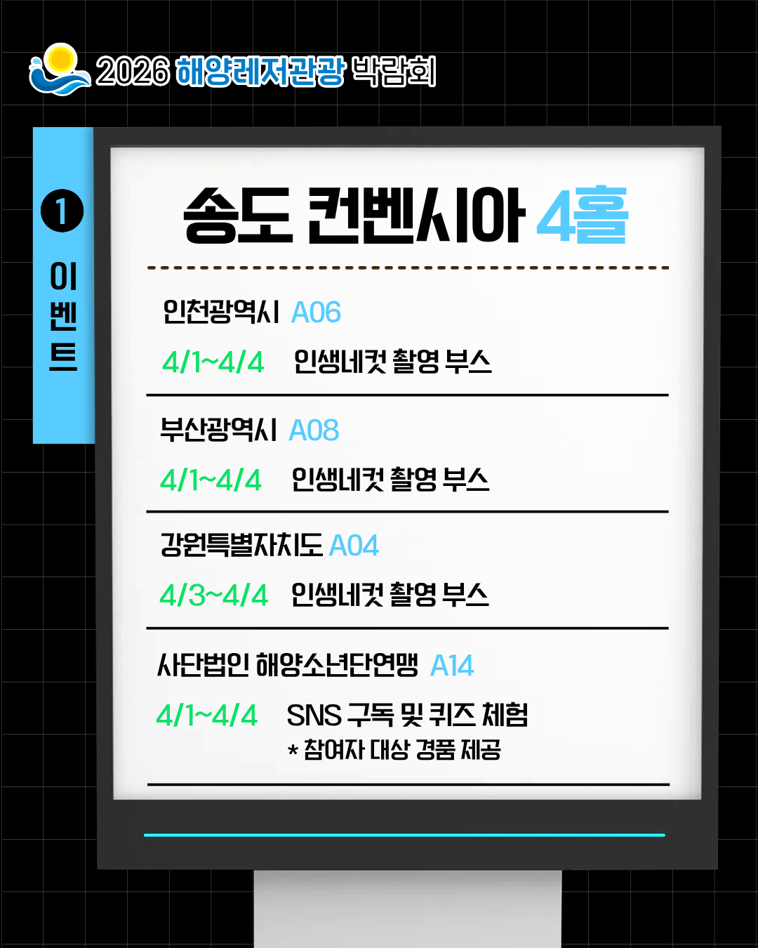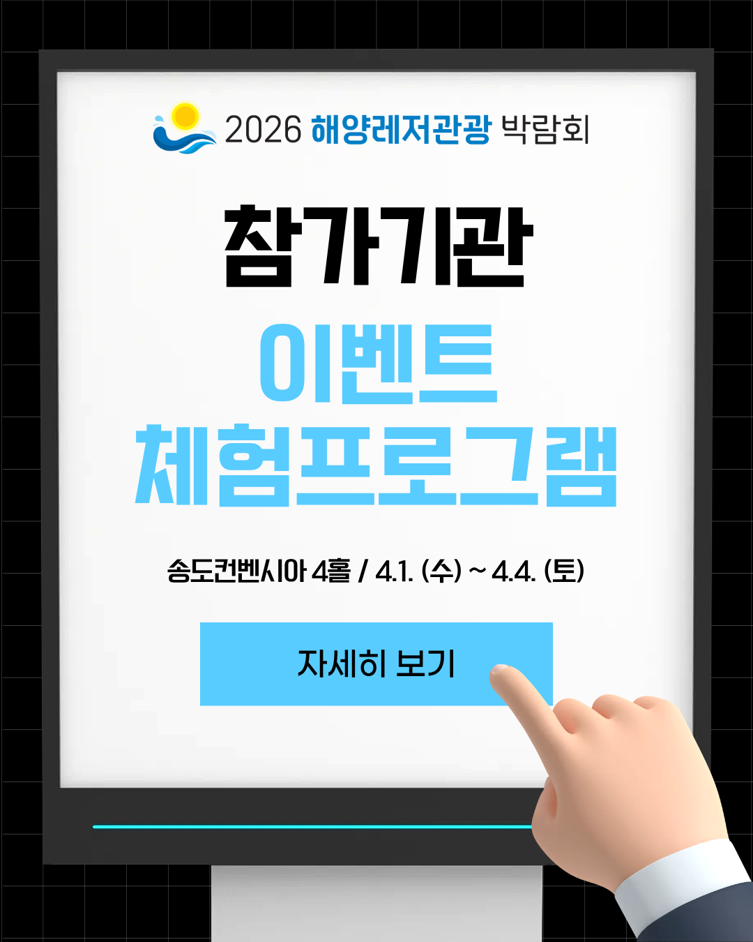참가기관 이벤트 & 체험프로그램 안내 등록일2026.03.31 조회수11 댓글 0댓글쓰기 댓글목록 등록된 댓글이 없습니다. 이전글 이전 글이 없습니다. 다음글 에어로케이 X 해양레저관광박람회 항공권 이벤트 안내 목록