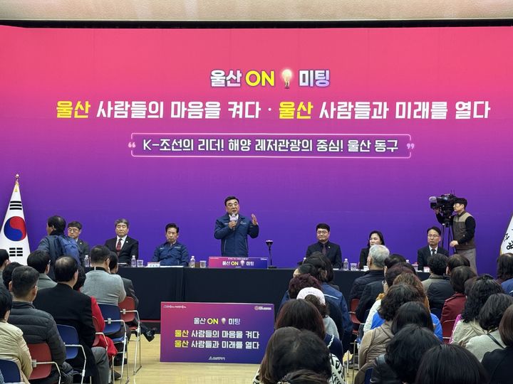 울산시가 11일 동구청 대강당에서 김두겸 울산시장과 동구 주민 등 300여명이 참석한 가운데 '울산 온(ON) 미팅'을 진행 중이다. (사진=울산시 제공) 2026.03.11.