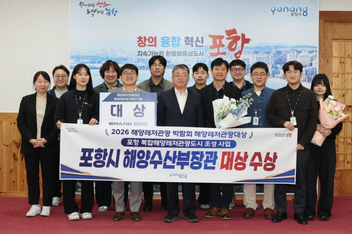 포항시는 인천 송도컨벤시아에서 열린 ‘2026 해양레저관광 박람회’에 참여해 해양레저관광 분야 공공부문 ‘해양관광자원 콘텐츠 개발’ 분야 대상을 수상하며 해양수산부 장관상을 받았다고 6일 밝혔다.